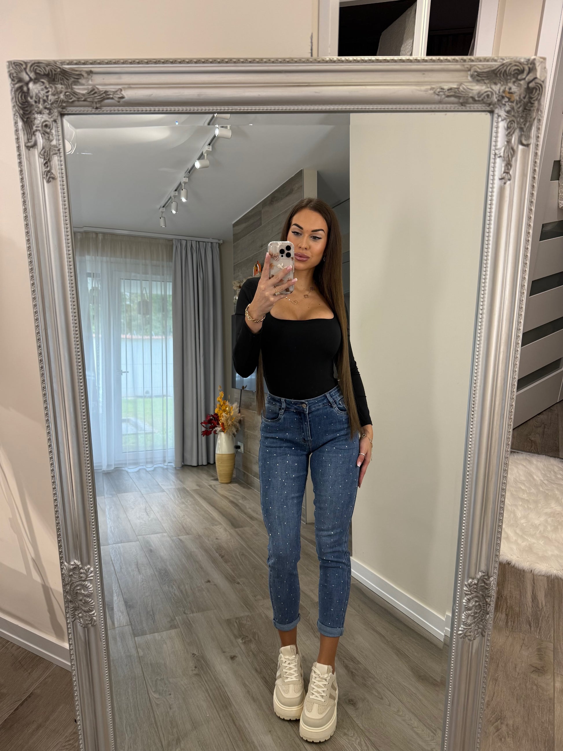 ‘Glam Dots' strasszkövekkel díszített farmernadrág (Mom fit - push up)