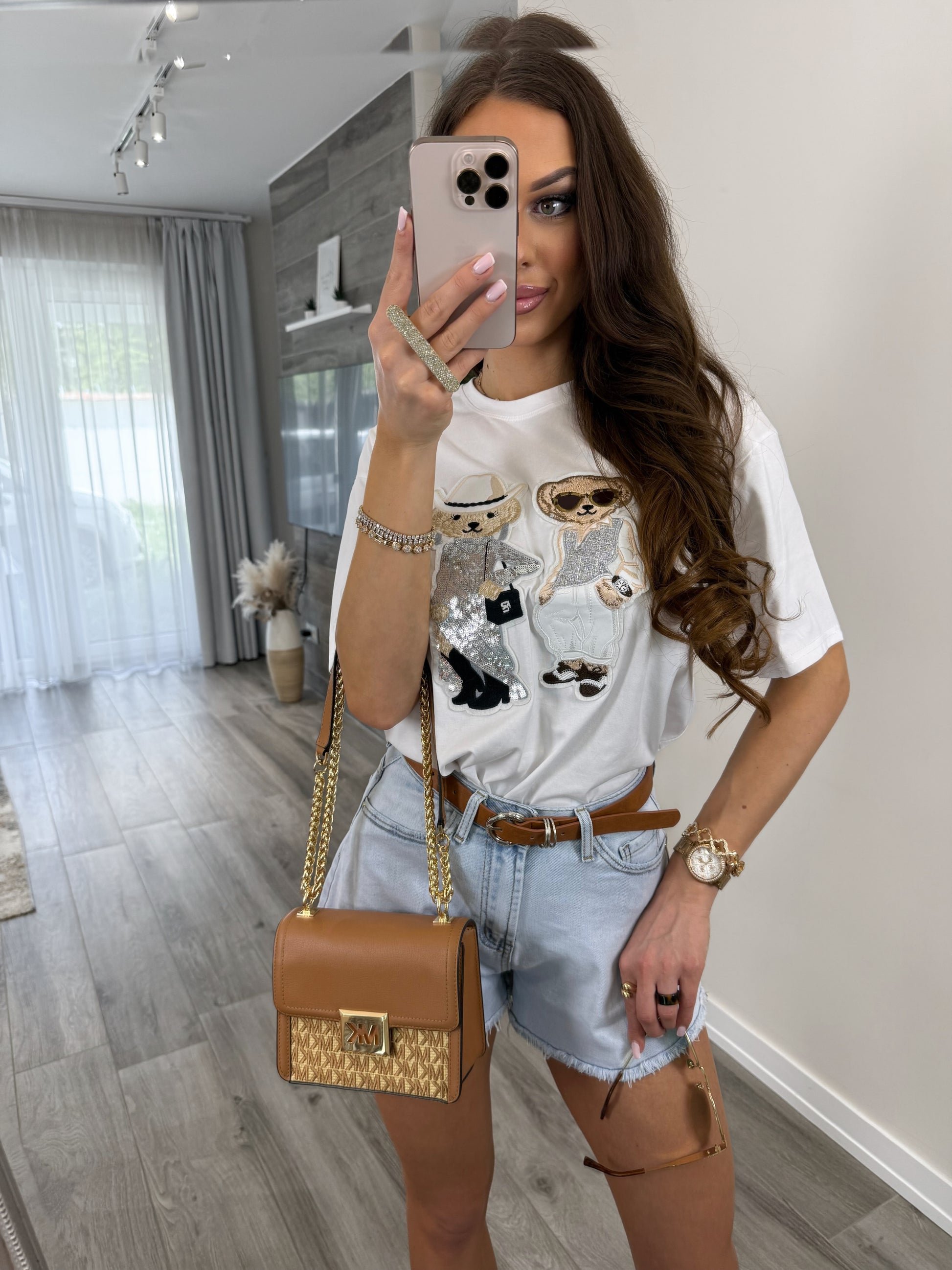 Macis csillogós mintás póló. Tökéletes választás a hétköznapokra, irodába egyaránt. Kombináld az 'Nude Obsession' farmernadrággal!